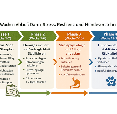 Wir beruhigen den Verdauungstrakt, reduzieren Reizfaktoren und schaffen eine Fütterung, die im Alltag funktioniert. Nicht mit 100 Regeln, sondern mit einem klaren Plan, der messbar macht, was deinem Hund bekommt.